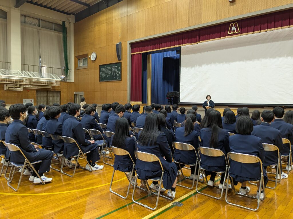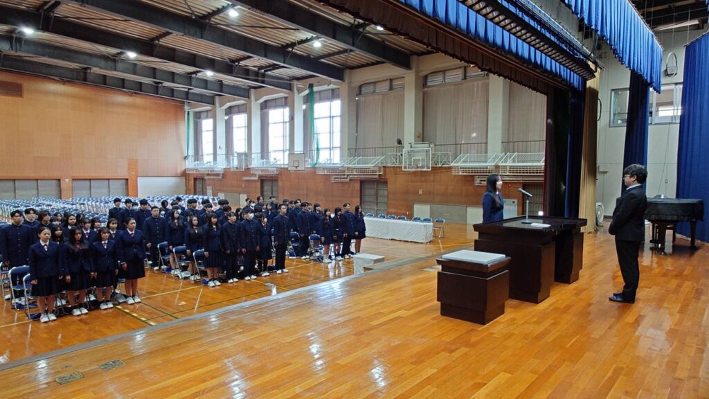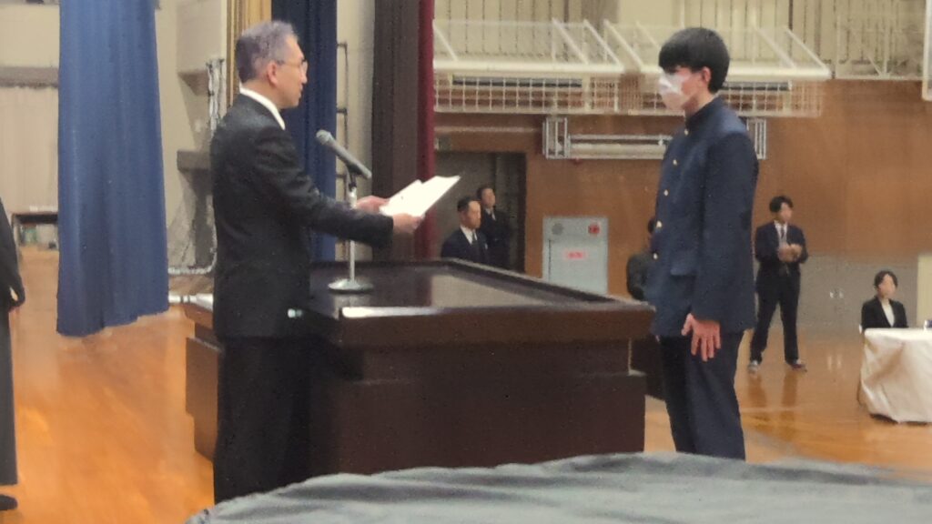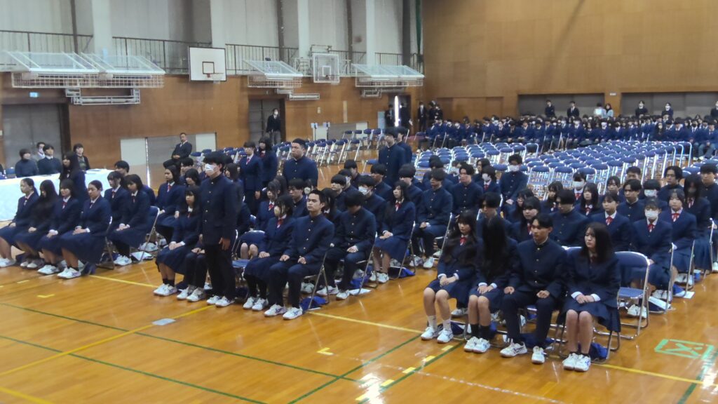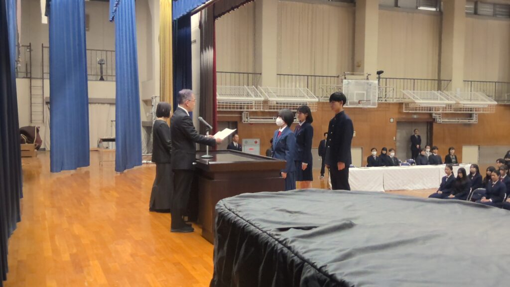 2月28日(金)に第3学年の同窓会入会式と表彰式が行われました。表彰式では生徒が3年間の成果として、御津あおば校賞や優秀賞、皆勤賞などを受賞しました。