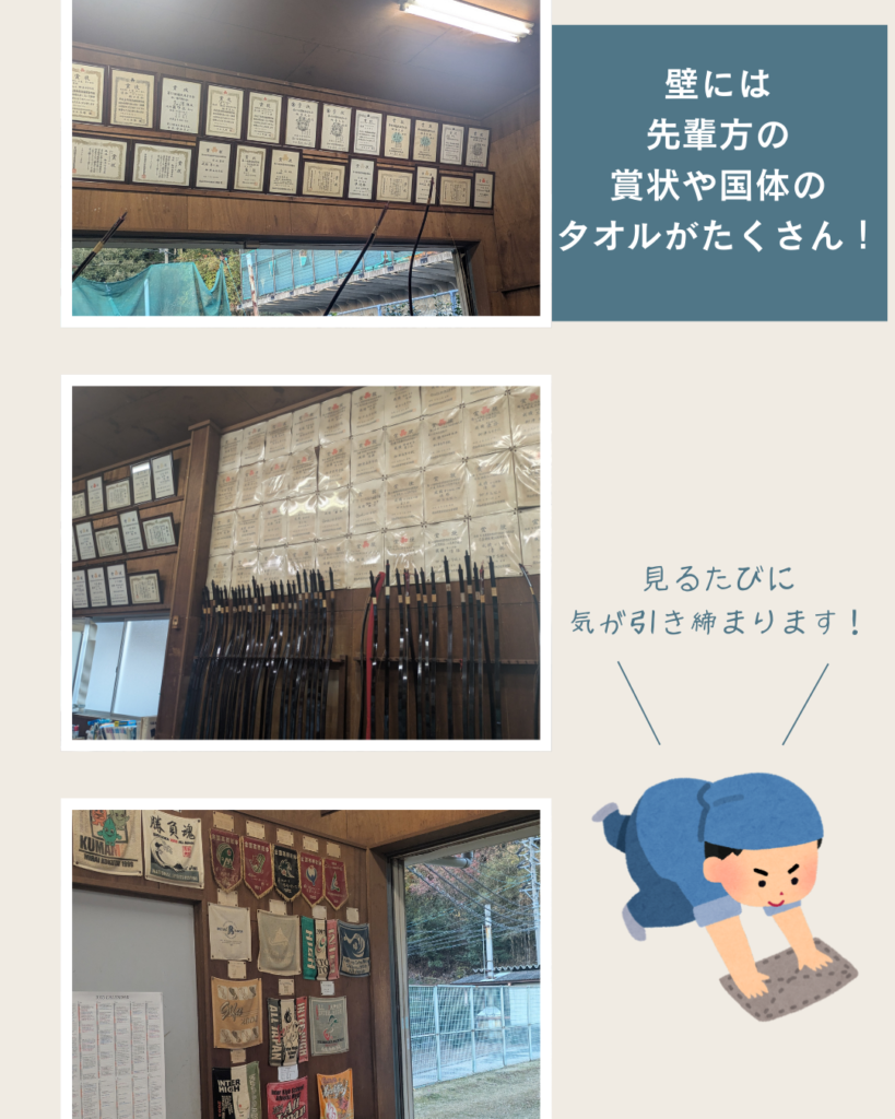 歴代の先輩方の賞状やタオルを見ながら、「自分たちも頑張ろう!」という気持ちを新たにしました。